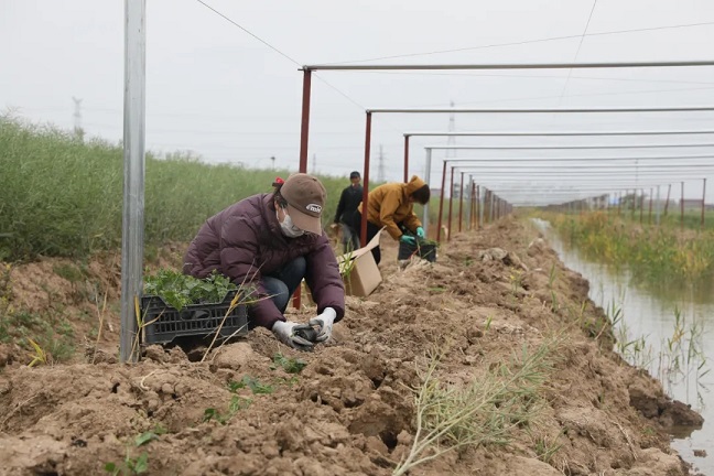 5月8日,在濱淮農(nóng)場高效農(nóng)業(yè)中心,一群志愿者正忙碌在溝邊的零星隙地,他們搬苗、栽種、覆土,精心種植瓜蔞,為原本荒蕪的溝邊增添了一抹生機與希望。